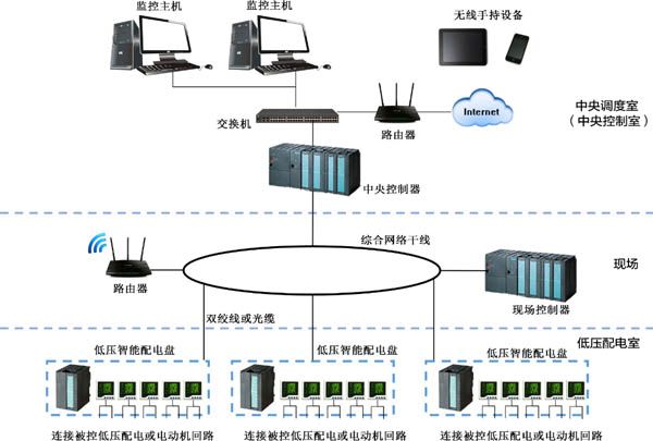 Intelligent low voltage power distribution system can monitor, collect and record the open-close state, voltage, current, power factor, kilowatt-hours, frequency and other parameters of the circuit in a real-time manner, and allow automatic prompting, alarming and tripping according to the set threshold value, thus protecting the distribution circuit, transformer and motor etc. Digital control is adopted for the whole system, which is characterized by high reliability, low cost, easy maintenance and expansion etc., and reaches unattended operation level.